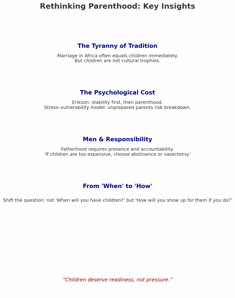 Rethinking Parenthood: Breaking Free from the “Children at All Costs” Mentality The Tyranny of Tradition In much of Africa, marriage is rarely seen as complete without children. From the moment… Continue reading Rethinking Parenthood: Breaking Free from the “Children at All Costs” Mentality